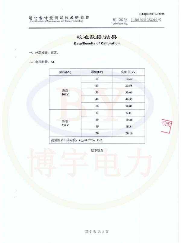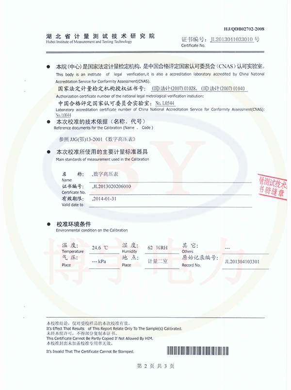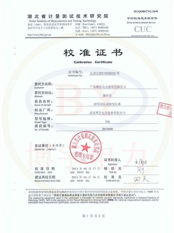 YD輕型高壓試驗變壓器校準證書