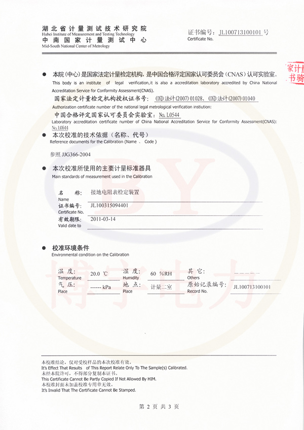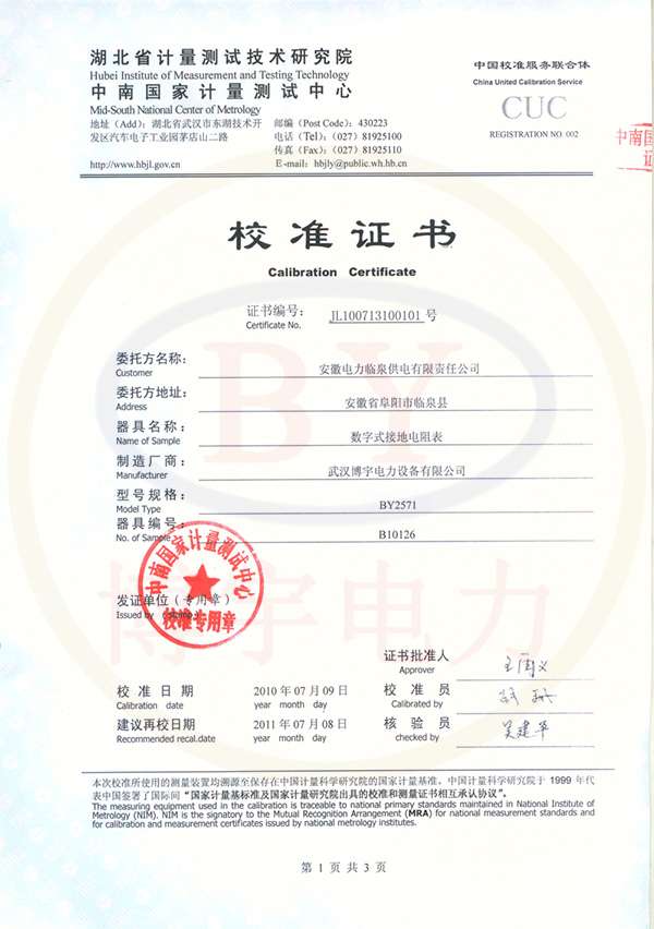 BY2671數(shù)字兆歐表校準(zhǔn)證書