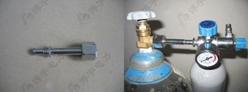 檢查試驗(yàn)用氣罐有無(wú)試驗(yàn)用氣源(氮?dú)饣?SPAN lang=EN-US>SF6氣體),如無(wú)試驗(yàn)用氣源無(wú)或氣壓不足(氣壓不能小于0.8MPa)需做好充氣工作(建議用戶(hù)到專(zhuān)業(yè)充氣點(diǎn)充好氣源,且氣壓不能大于2.0MPa),如無(wú)當(dāng)?shù)責(zé)o專(zhuān)業(yè)充氣點(diǎn)用戶(hù)也可用我公司配備的充氣桿與氣源對(duì)接自行充氣,如下圖所示: