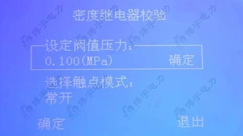 進(jìn)入“選擇觸點(diǎn)模式”菜單后用飛梭可以選擇密度繼電器的觸點(diǎn)模式,有“常開(kāi)”和“常閉”兩個(gè)選項(xiàng)。注意:觸點(diǎn)模式是指密度繼電器非帶載的狀態(tài)。設(shè)置完成后旋轉(zhuǎn)飛梭到最下面的“確定”選項(xiàng),按“飛梭確定鍵”進(jìn)入下一級(jí)菜單。