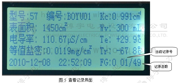 進入進入主菜單選擇查看記錄(圖5),然后用“↑”鍵和下鍵依次查看,長按“←”鍵2秒自動刪除當前記錄,長按“→”鍵2秒自動打印當前記錄。按“返回”鍵返回到主菜單。