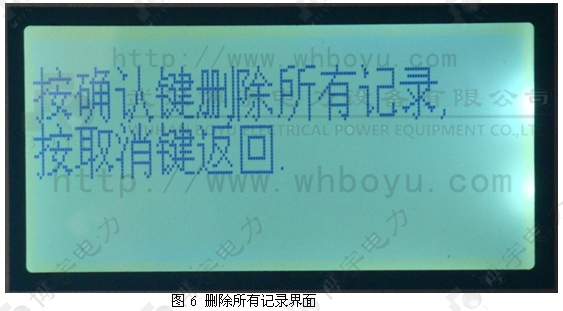 進入圖一主菜單后,按上下鍵選擇刪除記錄菜單按確認進入圖6界面。該界面是刪除全部記錄的操作,為了防止誤刪,我們多設計了一個提醒,就是只有長按“→”鍵2秒后屏幕上的確認被選中后才可以按“確認”鍵確認刪除。其他只需按屏幕提示操作即可。(提示:取消鍵也就是返回鍵)。按返回鍵可以到主菜單。
