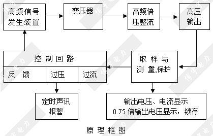 直高發應用最新電力電子技術,采用先進的PWM調制技術及大功率MOSFET器件,通過中頻倍壓整流而成;該發生器具有紋波系數小、輸出穩定可靠,體積小、重量輕的特點,且具有可靠、靈敏的內部保護功能,其原理框圖如下圖所示。